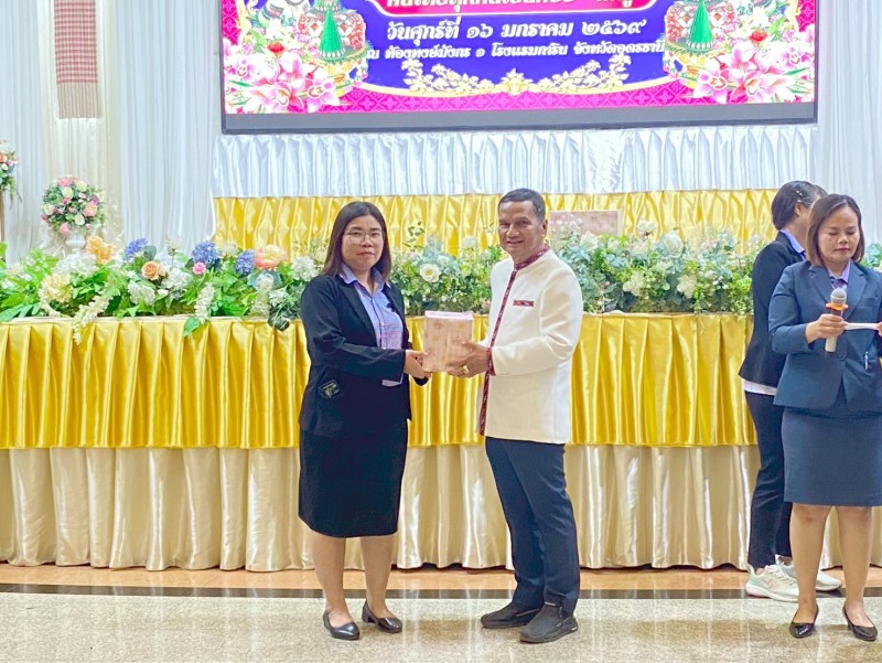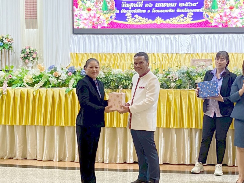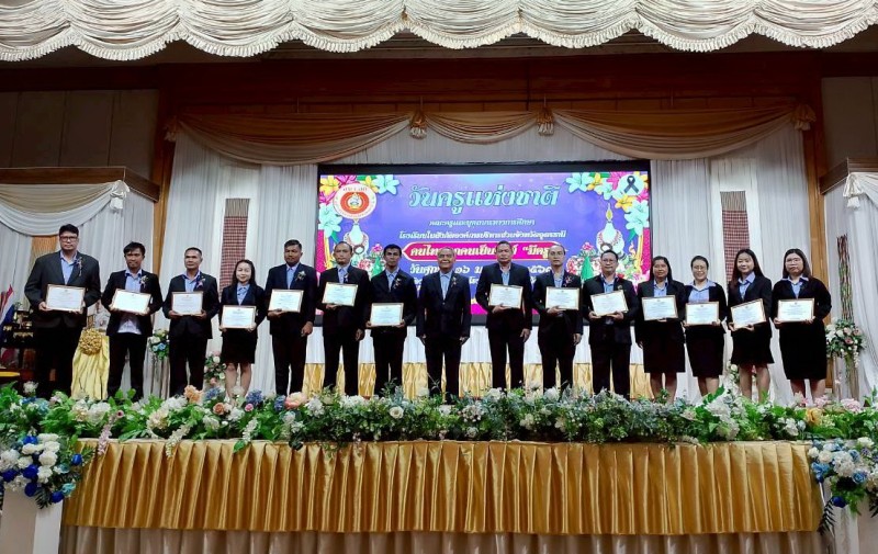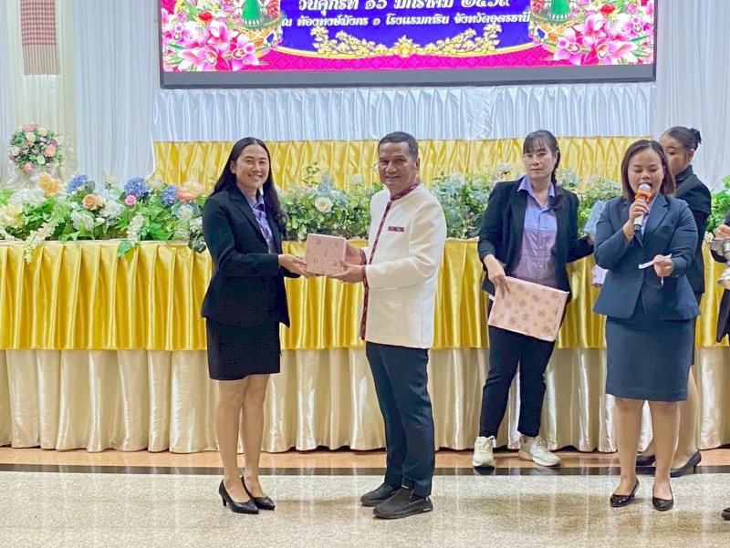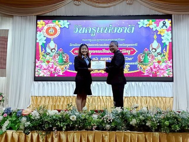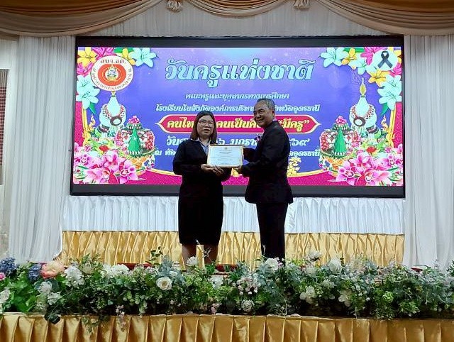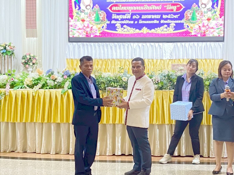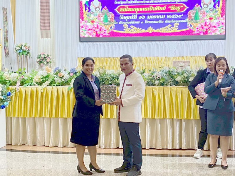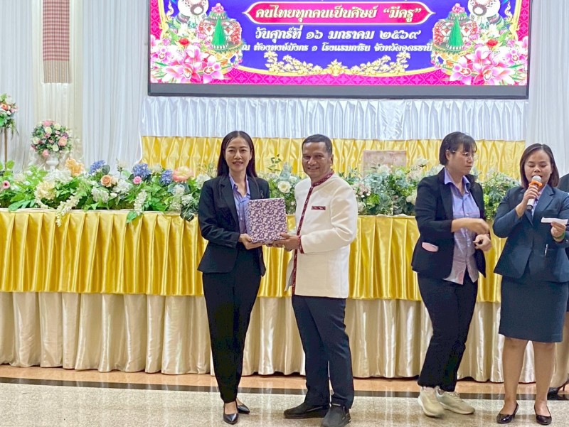 นายวชรอัษฎากร บุญภิละ ผู้อำนวยการสถานศึกษา โรงเรียนนาทรายวิทยา อบจ.อุดรธานี ๒ คณะครู บุคลากรทางการศึกษา พิธีระลึกถึงพระคุณบูรพาจารย์ พิธีมอบรางวัลประกาศเกียรติคุณผู้ประกอบวิชาชีพทางการศึกษา เนื่องในวันครู ประจำปี 2569 ณ โรงแรมการิน อุดรธานี