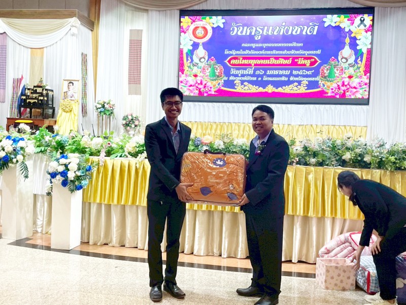 นายวชรอัษฎากร บุญภิละ ผู้อำนวยการสถานศึกษา โรงเรียนนาทรายวิทยา อบจ.อุดรธานี ๒ คณะครู บุคลากรทางการศึกษา พิธีระลึกถึงพระคุณบูรพาจารย์ พิธีมอบรางวัลประกาศเกียรติคุณผู้ประกอบวิชาชีพทางการศึกษา เนื่องในวันครู ประจำปี 2569 ณ โรงแรมการิน อุดรธานี